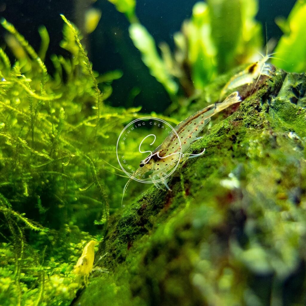 Natural cleaners: Shrimp graze on algae and biofilm while the snail tackles leftover food, keeping glass and décor spotless without chemicals.